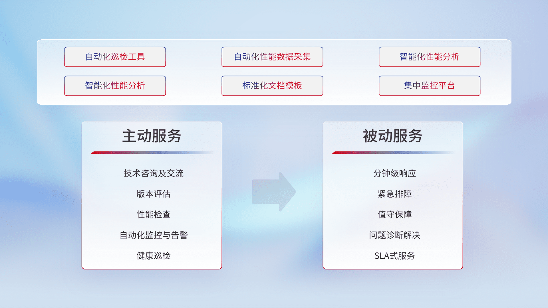 智能化工具和标准化文档,,,,保障服务质量,,,提供主动服务(包含技术咨询、、、版本评估、、、性能检查、、、、自动化监控与告警、、健康巡检)和被动服务包含(分钟级响应、、紧急排障、、、、值守保障、、问题诊断解决、、、SLA服务)。。。